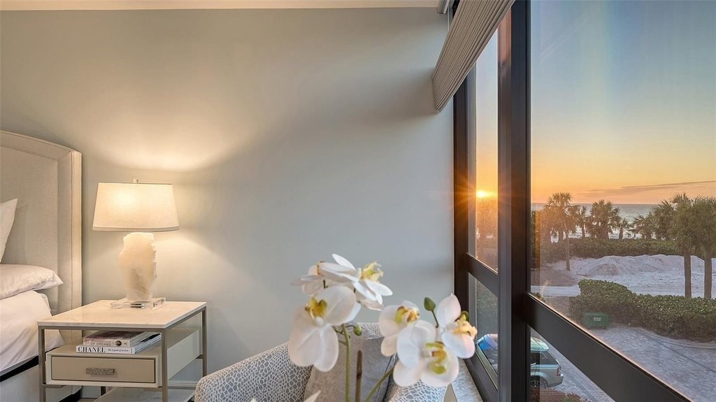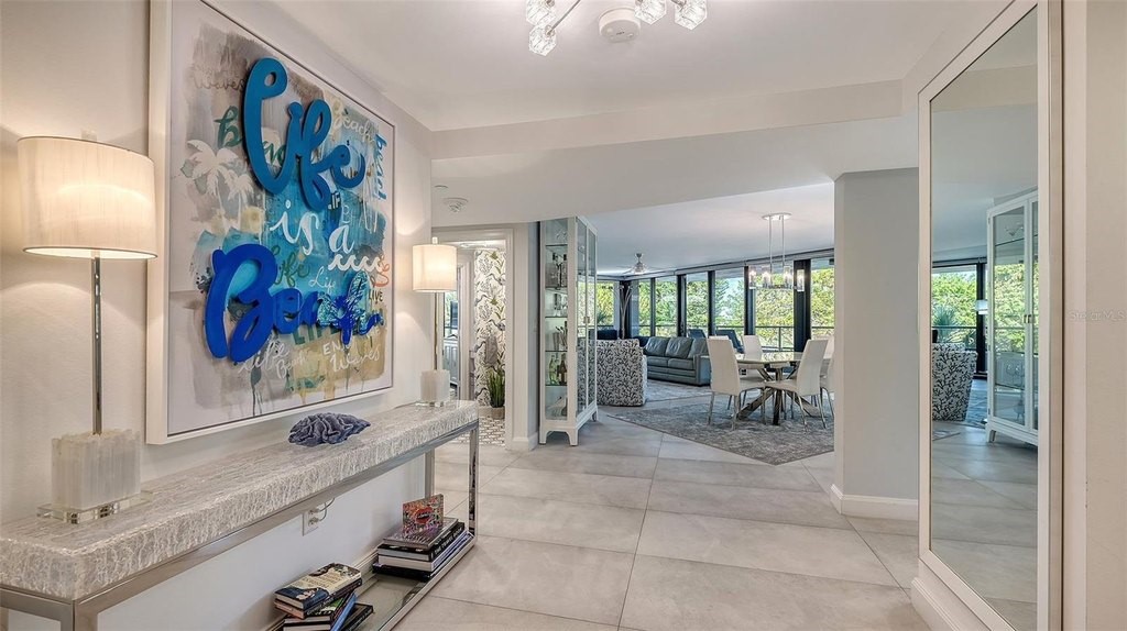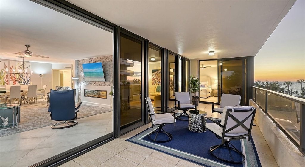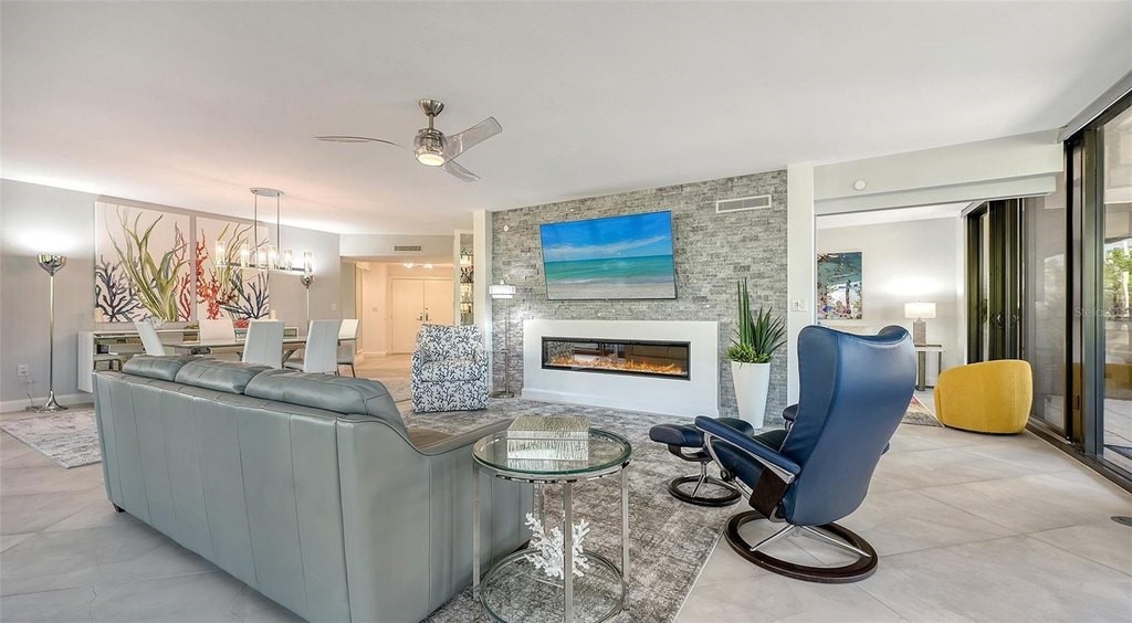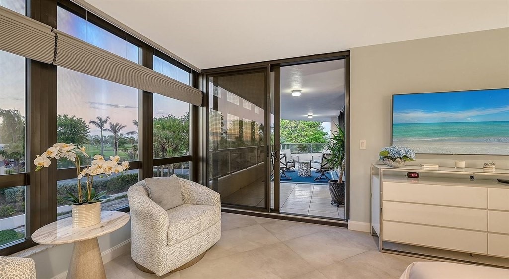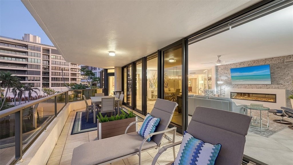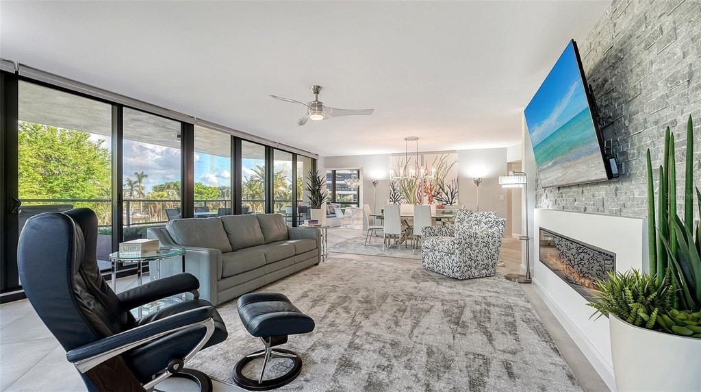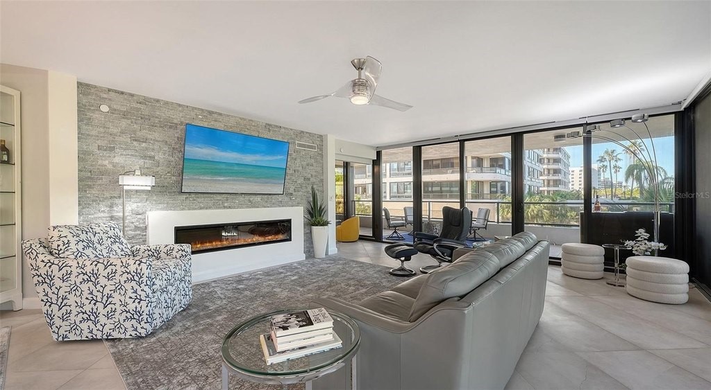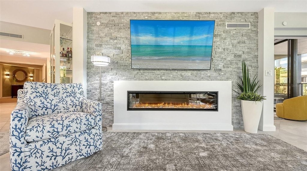 IT’S ALL DONE & PERFECT! Experience the pinnacle of Gulf Coast living at The Sanctuary, nestled behind the gates of the renowned Longboat Key Club & Resort and steps from the beach. This exquisitely remodeled 3-bedroom, 3-bath residence offers breathtaking views of the Gulf and panoramic views of the Longboat Key golf course from the expansive wrap-around terrace that’s complete with PGT impact sliding doors. The newly renovated interior features luxury materials to include large porcelain tile floors throughout, beautiful ledge stone accent wall with a striking 72” linear fireplace in the expansive great room, motorized solar screen window coverings and/or custom roman shades throughout and high-end appliances. The primary suite is a serene, spa-like experience featuring stunning views of the Gulf and direct access to the expansive terrace providing a seamless connection to the outdoors. The bathroom offers a custom double sink vanity, a deep soaking tub and a separate dressing vanity and linen closet with floor-to-ceiling azure tile surrounding both the tub and the shower. The elegant design creates a soothing, indulgent atmosphere perfect for unwinding. The large walk-in closets has an abundance of space & storage. The second ensuite is equally as stunning with high-end features including a double vanity, spacious walk-in shower adorned with wave shaped tiles perfectly complimenting the chic, beach-inspired design and a built-in mirrored make-up vanity. The third bedroom is also enjoyed as a den. The clever, seamless “sliding door” creates smart privacy to quickly transform the den into a cozy bedroom offering both short and long-term guests a comfortable retreat. This residence offers breathtaking views & sunsets every evening over the Gulf. It has a separate garage entry & 2 “Townie bikes” to convey. Relax in the luxury & privacy of 24/7 gated security, heated pool/spa with cabanas, beach chaises & umbrellas, Fitness center, 4 Har-Tru tennis courts, Resident only clubhouse for social events. It’s all here to host large family gatherings or intimate parties. IT’S ALL DONE & PERFECT!