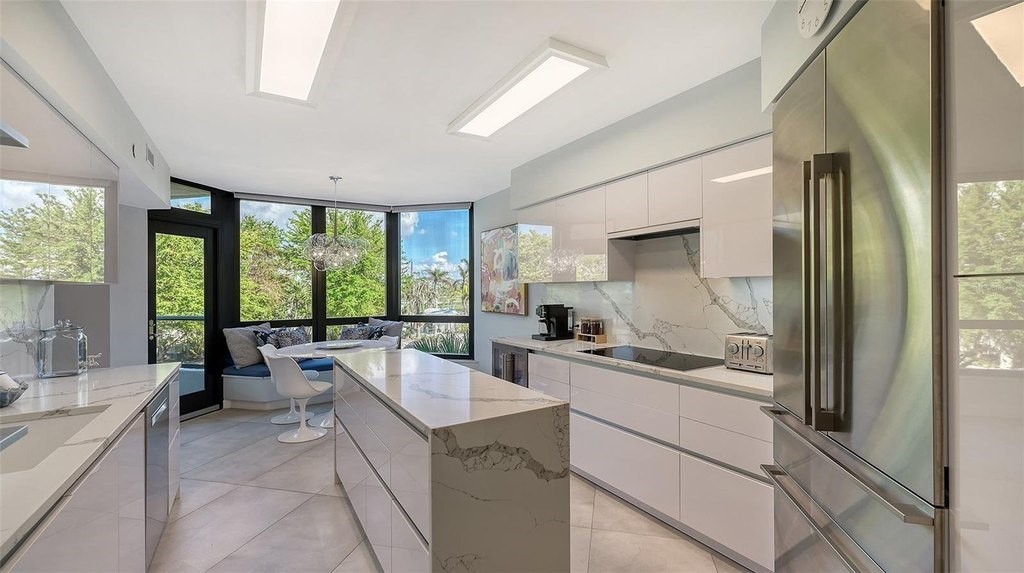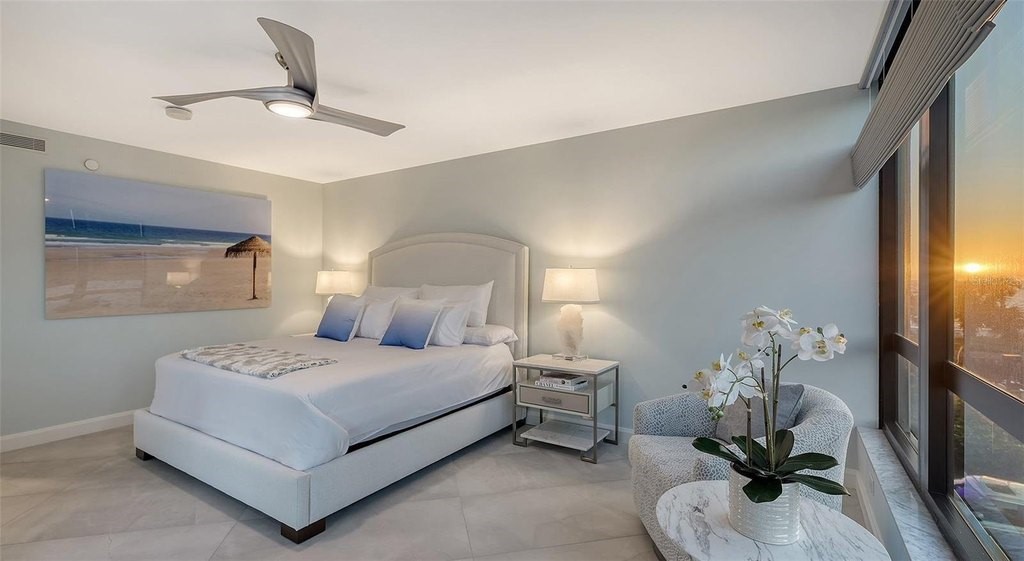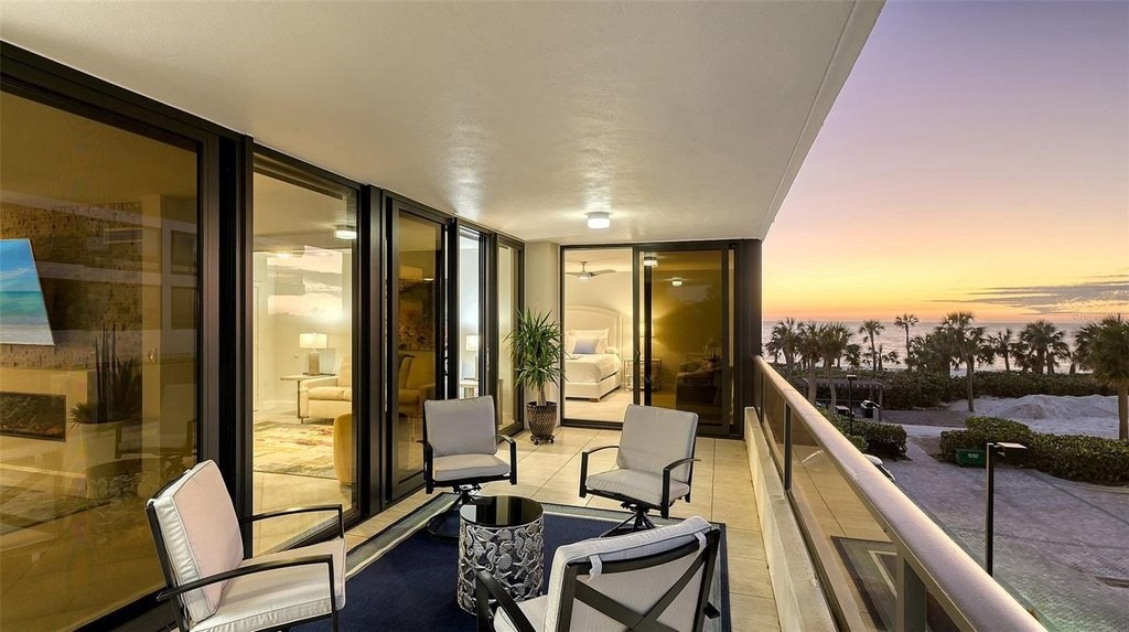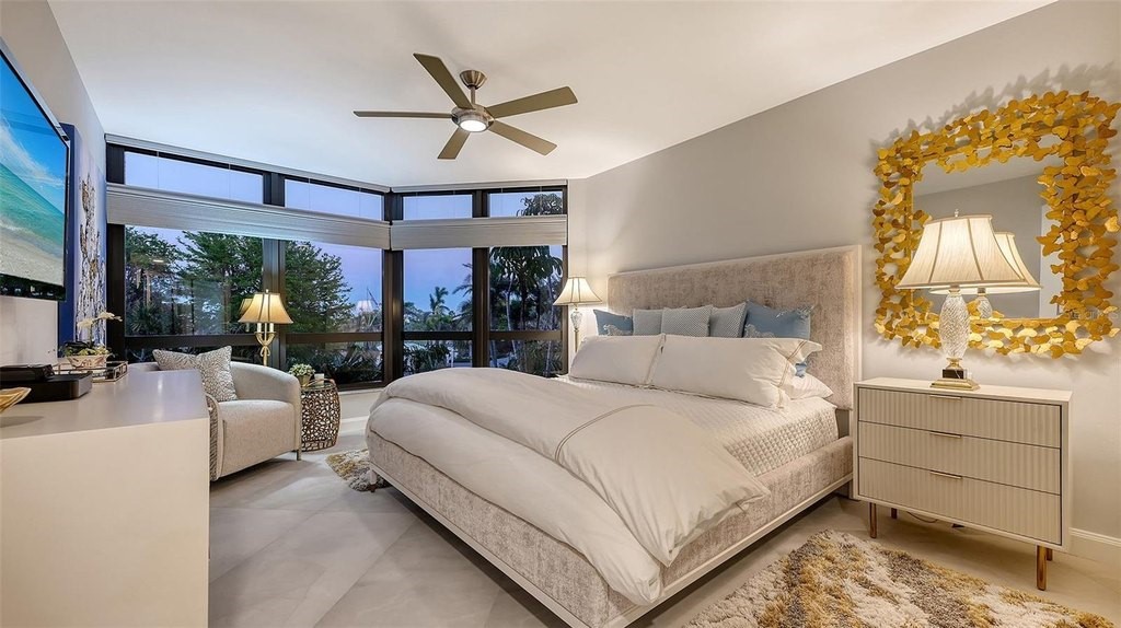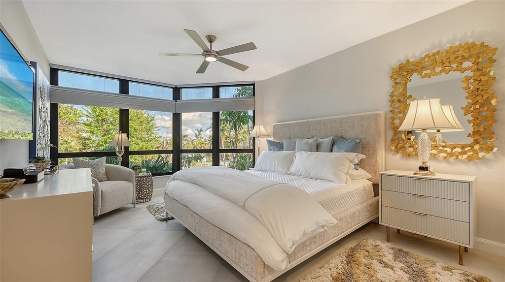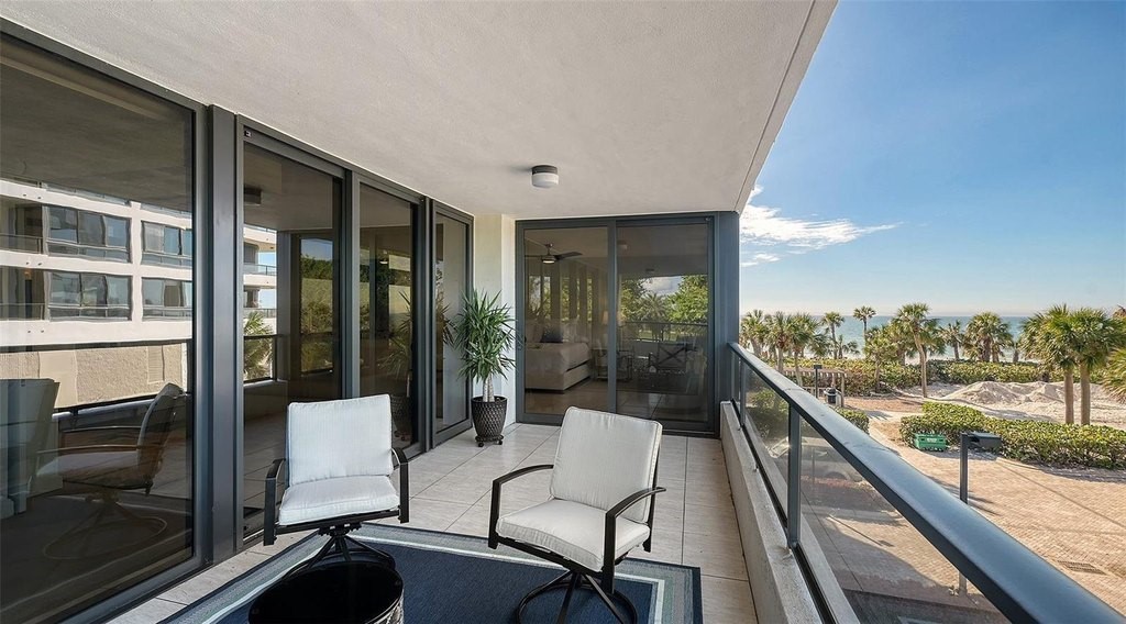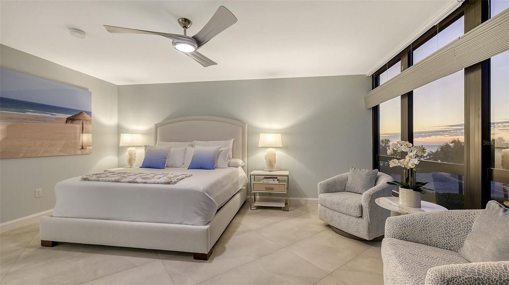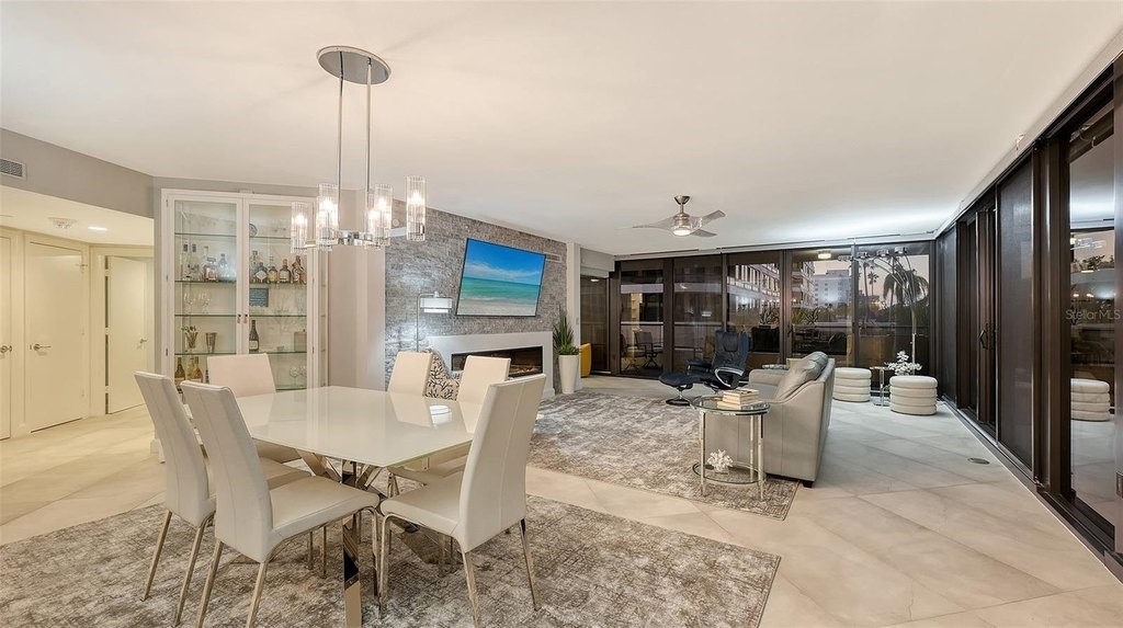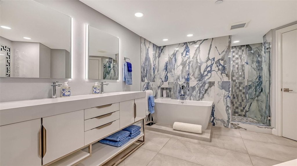 IT’S ALL DONE & PERFECT! Experience the pinnacle of Gulf Coast living at The Sanctuary, nestled behind the gates of the renowned Longboat Key Club & Resort and steps from the beach. This exquisitely remodeled 3-bedroom, 3-bath residence offers breathtaking views of the Gulf and panoramic views of the Longboat Key golf course from the expansive wrap-around terrace that’s complete with PGT impact sliding doors. The newly renovated interior features luxury materials to include large porcelain tile floors throughout, beautiful ledge stone accent wall with a striking 72” linear fireplace in the expansive great room, motorized solar screen window coverings and/or custom roman shades throughout and high-end appliances. The primary suite is a serene, spa-like experience featuring stunning views of the Gulf and direct access to the expansive terrace providing a seamless connection to the outdoors. The bathroom offers a custom double sink vanity, a deep soaking tub and a separate dressing vanity and linen closet with floor-to-ceiling azure tile surrounding both the tub and the shower. The elegant design creates a soothing, indulgent atmosphere perfect for unwinding. The large walk-in closets has an abundance of space & storage. The second ensuite is equally as stunning with high-end features including a double vanity, spacious walk-in shower adorned with wave shaped tiles perfectly complimenting the chic, beach-inspired design and a built-in mirrored make-up vanity. The third bedroom is also enjoyed as a den. The clever, seamless “sliding door” creates smart privacy to quickly transform the den into a cozy bedroom offering both short and long-term guests a comfortable retreat. This residence offers breathtaking views & sunsets every evening over the Gulf. It has a separate garage entry & 2 “Townie bikes” to convey. Relax in the luxury & privacy of 24/7 gated security, heated pool/spa with cabanas, beach chaises & umbrellas, Fitness center, 4 Har-Tru tennis courts, Resident only clubhouse for social events. It’s all here to host large family gatherings or intimate parties. IT’S ALL DONE & PERFECT!